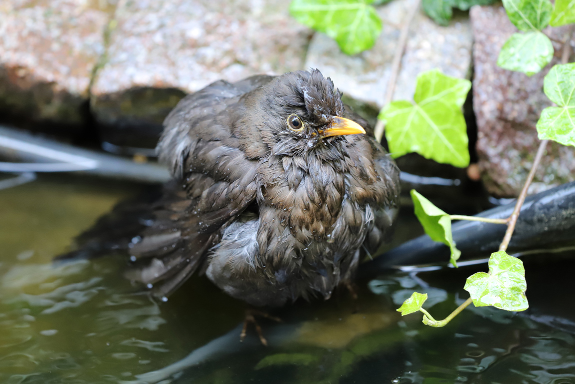 Ein paar Amseln die mich schon kennen und keine Angst vor mir haben waren dann doch drin. Eine badet bei warmen Temperaturen immer in meinem Teich, da sind mir folgende Bilder gelungen: