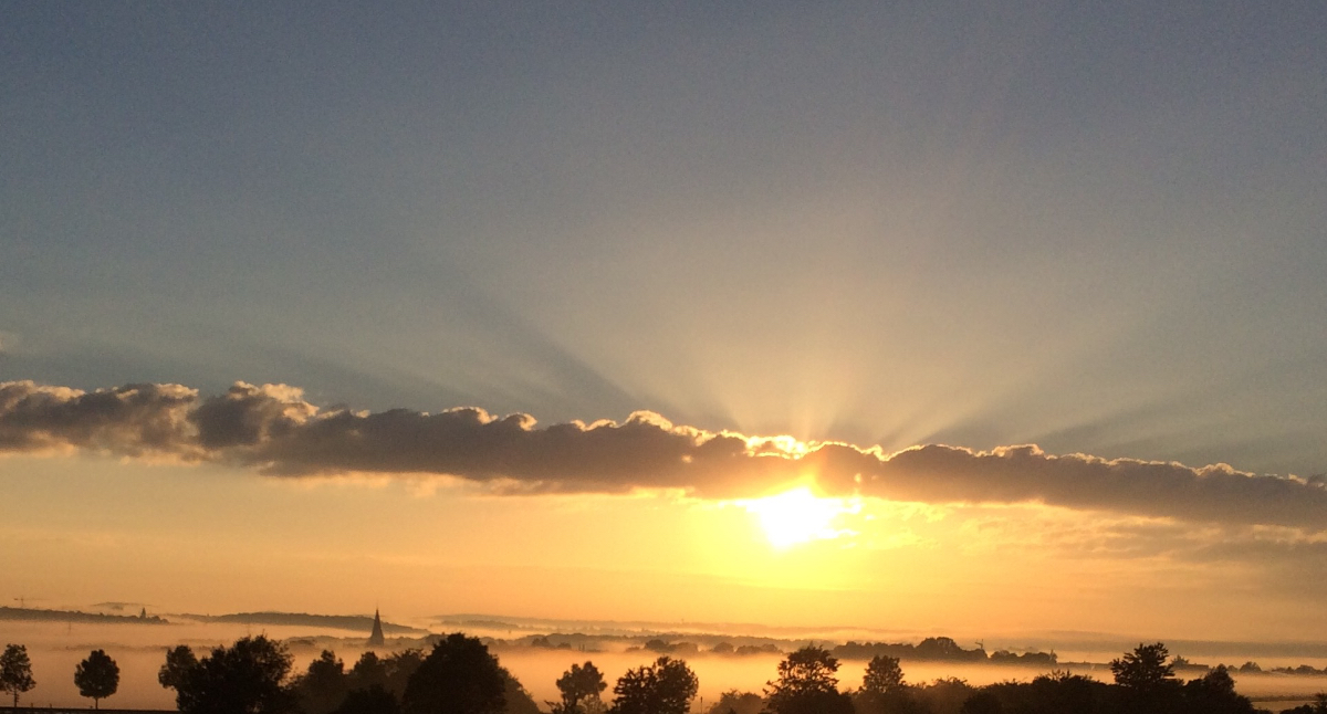Nach circa fünf Minuten war ich dann in der Nähe des Wasserturms bei Häslach. Blick Richtung Nordwesten über den Schönbuch (/Betzenberg, davor der Einschnitt des Schaichtals im Dunkeln; der Funkturm bei Waldenbuch links neben der Sonne):