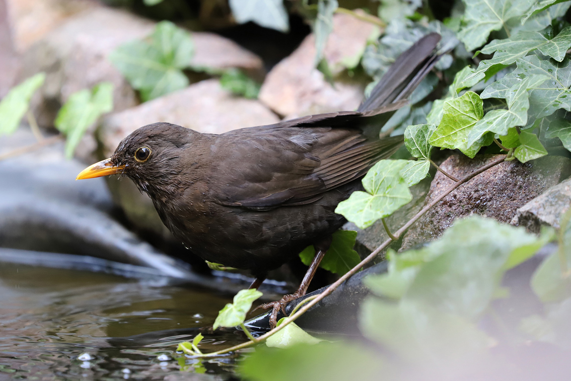 Ein paar Amseln die mich schon kennen und keine Angst vor mir haben waren dann doch drin. Eine badet bei warmen Temperaturen immer in meinem Teich, da sind mir folgende Bilder gelungen: