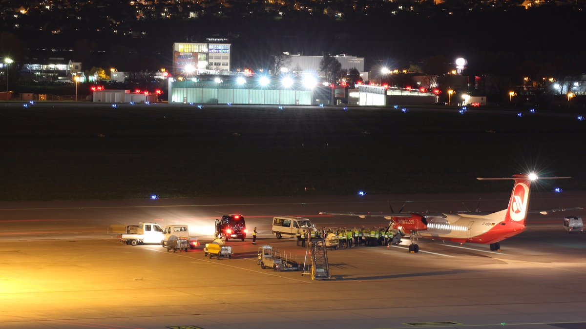 Kurz nach 22 Uhr landete die ABNY wieder in Stuttgart, sie wurde von drei Marshaller Fahrzeugen durch die Wasserdusche begleitet ...