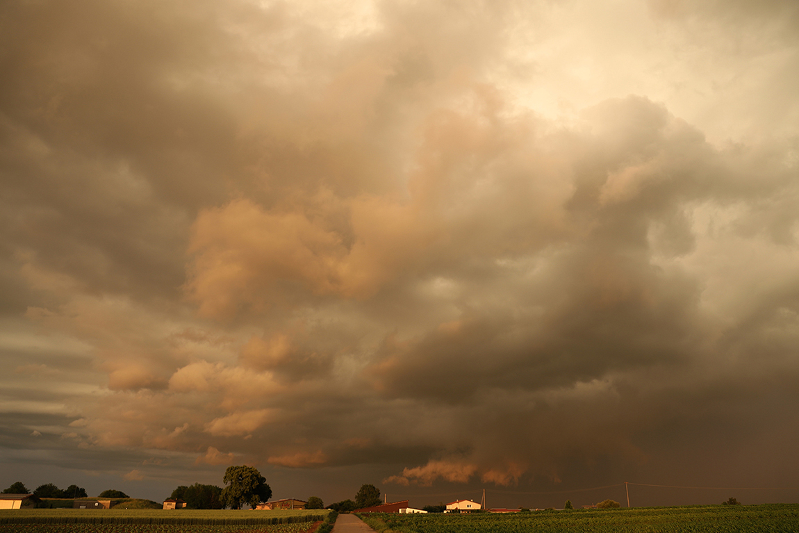 Ich hatte das 18-135 mm auf der Kamera, meistens bei 18 mm - das 10-18 wäre im Nachhinein die bessere Entscheidung gewesen, um die ockerfarbene Wolke, die sich nicht nur in der Helligkeit, sondern tatsächlich auch in der Farbe vom restlichen Himmel abhob, besser in ihrer ganzen Ausdehnung einzufangen. Objektivwechseln hätte ich aber in dem Regen auch nicht wollen, jeder einzelne Tropfen hinterließ Staubflecken, als wären es Spritzer aus einer dreckigen Pfütze. Ich glaub´, ich hab zu Hause länger den Staub aus den Rillen der Zoom- und Fokusgummierung geputzt, als ich unterwegs war