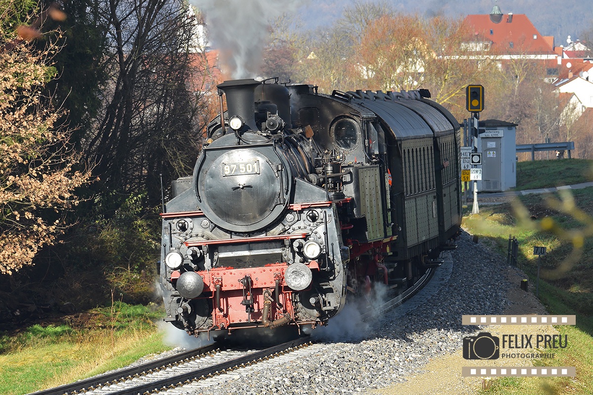 Bespannt mit der Zahnraddampflok 97 501 "Paula" - Baujahr 1922 - wird insgesamt viermal zwischen Nürtingen und Neuffen gependelt.