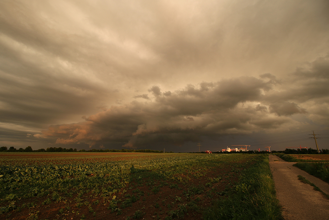 Ich hatte das 18-135 mm auf der Kamera, meistens bei 18 mm - das 10-18 wäre im Nachhinein die bessere Entscheidung gewesen, um die ockerfarbene Wolke, die sich nicht nur in der Helligkeit, sondern tatsächlich auch in der Farbe vom restlichen Himmel abhob, besser in ihrer ganzen Ausdehnung einzufangen. Objektivwechseln hätte ich aber in dem Regen auch nicht wollen, jeder einzelne Tropfen hinterließ Staubflecken, als wären es Spritzer aus einer dreckigen Pfütze. Ich glaub´, ich hab zu Hause länger den Staub aus den Rillen der Zoom- und Fokusgummierung geputzt, als ich unterwegs war