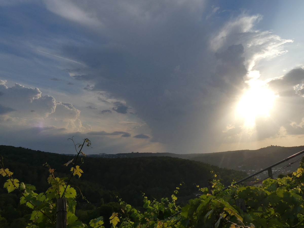 Ich hatte das 18-135 mm auf der Kamera, meistens bei 18 mm - das 10-18 wäre im Nachhinein die bessere Entscheidung gewesen, um die ockerfarbene Wolke, die sich nicht nur in der Helligkeit, sondern tatsächlich auch in der Farbe vom restlichen Himmel abhob, besser in ihrer ganzen Ausdehnung einzufangen. Objektivwechseln hätte ich aber in dem Regen auch nicht wollen, jeder einzelne Tropfen hinterließ Staubflecken, als wären es Spritzer aus einer dreckigen Pfütze. Ich glaub´, ich hab zu Hause länger den Staub aus den Rillen der Zoom- und Fokusgummierung geputzt, als ich unterwegs war